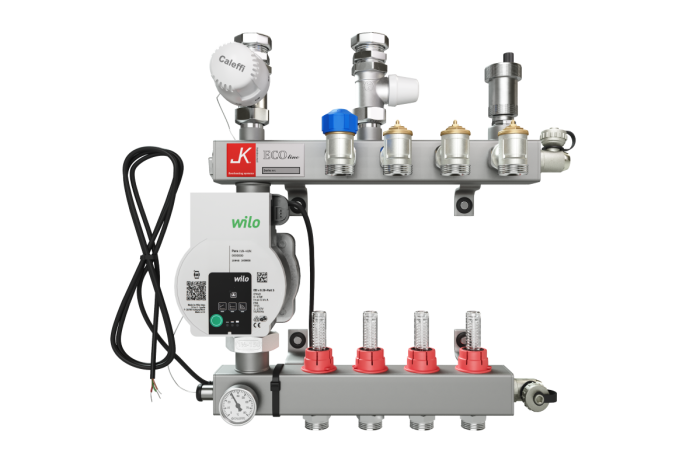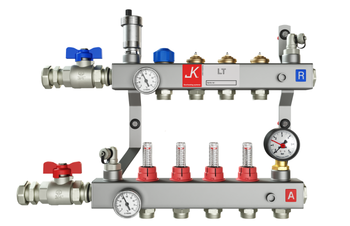 The JK® LT manifold is not fitted with a circulation pump, making it an ideal fit for any heating system with a low temperature (< 55°C) heat source. The water supply is usually provided by a remote water pump, which circulates the water through the underfloor tubing, and is often part of a renewable energy system, such as solar panels, ground-source heat pumps (GSHP), air-source heat pumps (ASHP) or high efficiency electric, hydrogen or gas boilers.