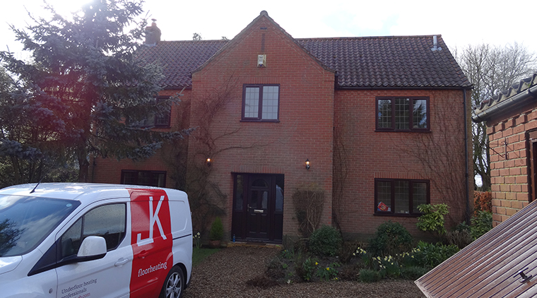 This detached home is a very spacious property in the village of Little Dunham, situated in the Breckland District of Norfolk near Kings Lynn in the East of England. The ground floor, a screed floor, is completely provided with JKs in-ground UFH ™ water underfloor heating system. The house is divided into 5 zones, which can be all controlled separately. Since the heating pipe is directly under the surface, JKs in-ground UFH ™ is much more accurate and responsive then traditional wet underfloor heating systems.