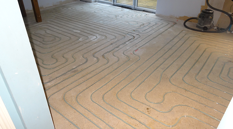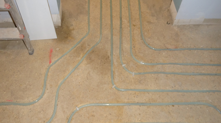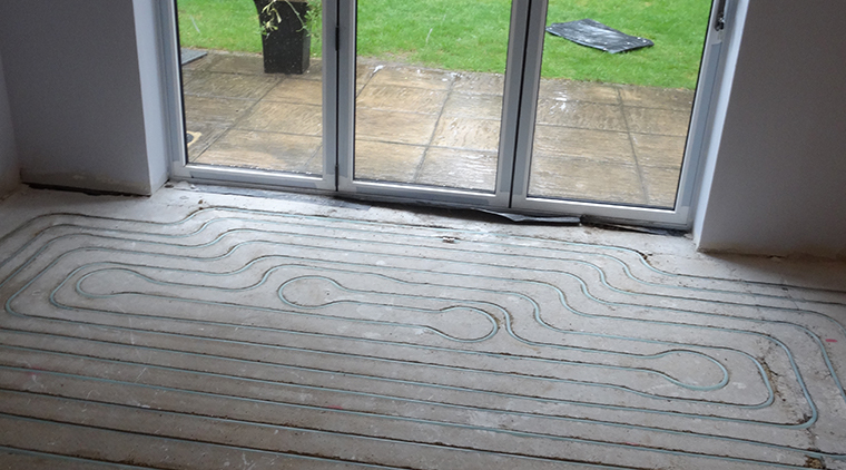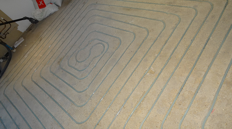 ‘The subfloor construction, a sand-cement screed floor, is perfectly suitable for JKs in-ground | Zero build-up water underfloor heating system. The other floor levels in the living room and hallway are zero build-up – exactly what is needed to avoid steps and floor height differences.’